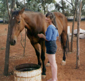 After several months of TLC, gaining both Chevelle's trust and confidence, Chevelle realized that Leeanne wasn't going to hurt him and had his best interests in mind, slowly a bond and partnership formed between these two, even though Chevelle was a huge animal and Leeanne was tiny compared to him he began to trust her. Now when ever Leeanne goes to put a bridle or a headstall on him, Chevelle lowers his huge head to her hip so she doesn't have to stretch and silly as it sounds this big sook actually frets for Leeanne if she is away for more than two days.